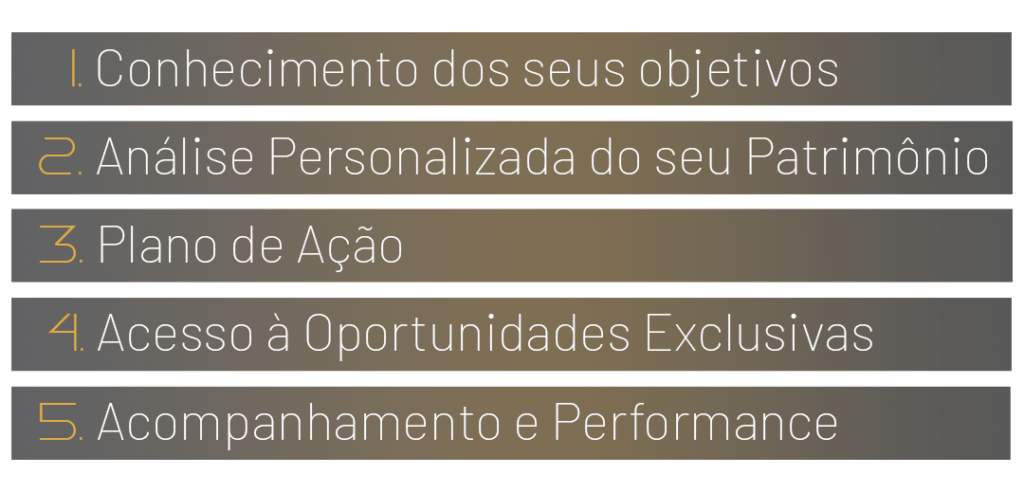 Expertise, estratégia e análises continuas são essenciais para alcançar o sucesso nos investimentos. Esses elementos serão explorados em nossa primeira reunião de diagnóstico, na qual analisaremos sua situação financeira e pessoal e trabalharemos em cima das suas metas de objetivos de curto, médio e longo prazo.